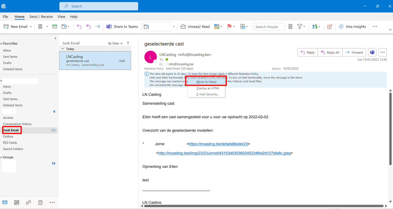 1. Ga naar uw spam folder. 2. Klik om het tekstje dat aangeeft dat de mail 30 dagen in de spam blijft. 3. Er verschijnt een keuzelijstje. Kies hier Move to inbox.