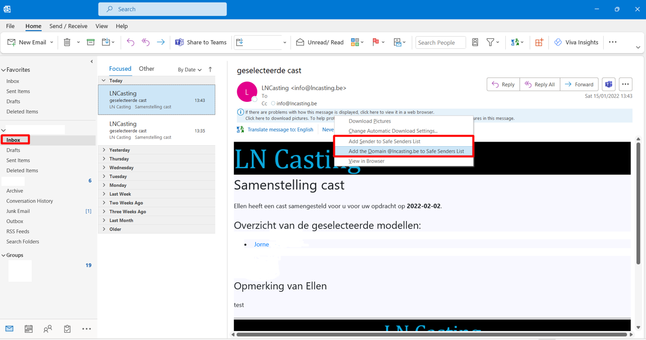 Het kan gebeuren dat onze emails bij jouw spam belanden. Hierdoor kunnen er emails verloren gaan en om dat te voorkomen, kan je het beste info@lncasting.be toevoegen aan jouw adresboek of aan jouw vertrouwde contacten.